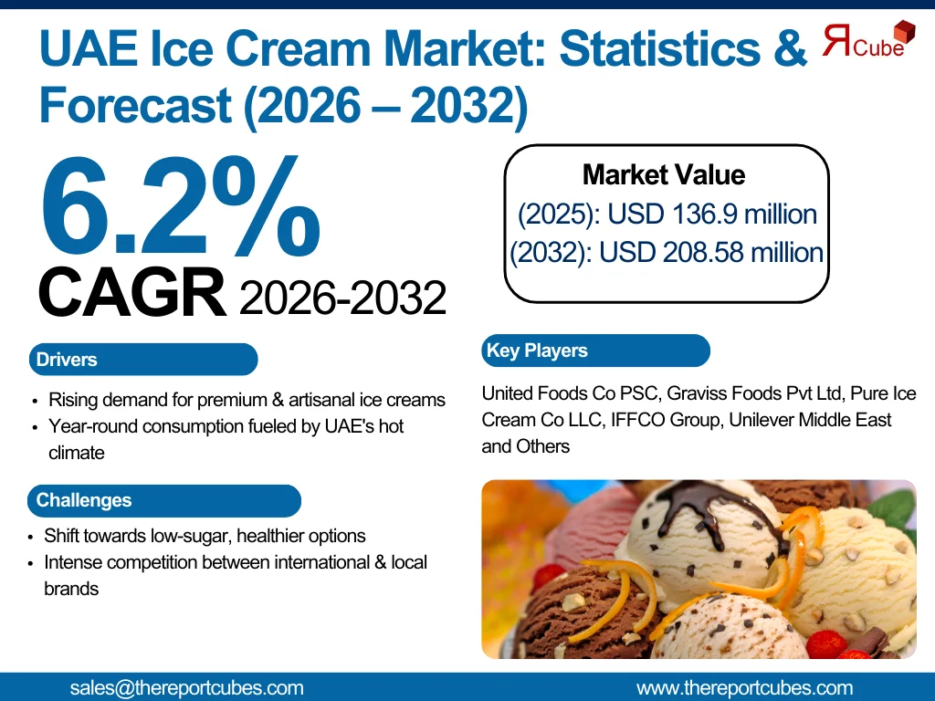 The Report Cube which is one of the leading market research company in UAE expects the UAE Ice Cream Market to grow at a CAGR of around 6.2% through 2032, as highlighted in their latest research report. The study provides an in-depth analysis of the emerging trends shaping the UAE Ice Cream Market and offers detailed forecasts for its potential growth during 2026–2032. The report also presents a comprehensive assessment of the competitive landscape, including profiles of leading players, their performance metrics, and recent strategic developments. Additionally, it explores the key market drivers, challenges, opportunities, and provides insights into historical and future revenue trends at the global, regional, and country levels.