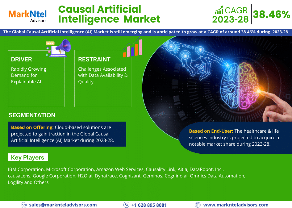 The Global Causal Artificial Intelligence (AI) Market is still emerging and is anticipated to grow at a CAGR of around 38.46% during the forecast period, i.e., 2023-28.