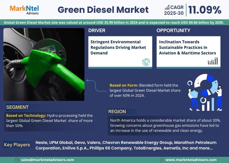 As per recent study by MarkNtel Advisors The Global Green Diesel Market size was valued at around USD 35.99 billion in 2024 and is expected to reach USD 69.86 billion by 2030. Along with this, the market is estimated to grow at a CAGR of around 11.09% during the forecast period, i.e., 2025-30.