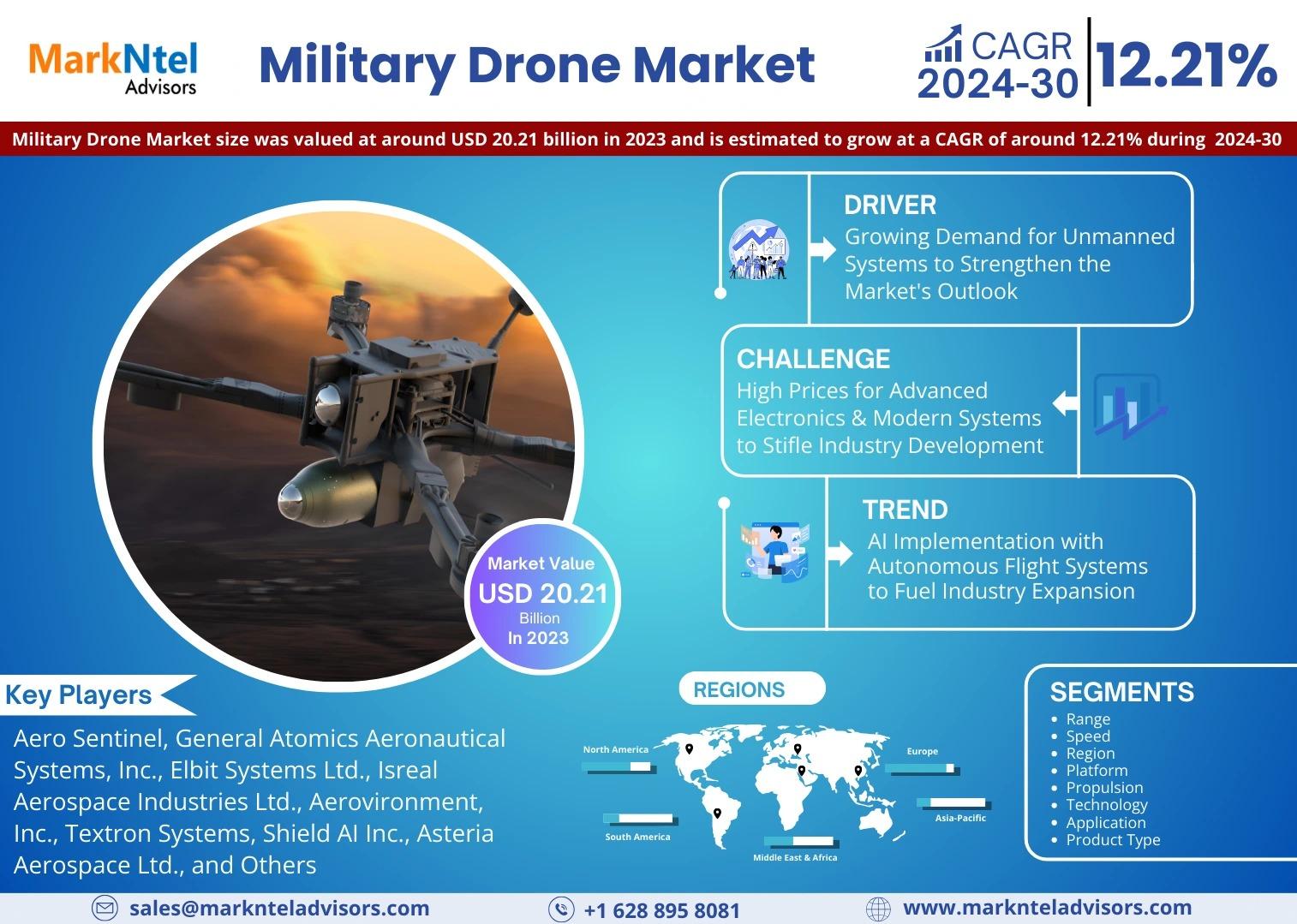 As per recent study by MarkNtel Advisors The Global Military Drone Market size was valued at around USD 20.21 billion in 2023 and is estimated to grow at a CAGR of around 12.21% during the forecast period, i.e., 2025-30.