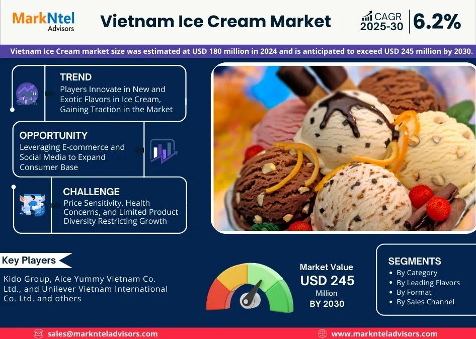 As per recent study by MarkNtel Advisors The Vietnam Ice Cream Market is anticipated to grow at a CAGR of around 6.2% during 2025-2030. The Ice Cream Market size in Vietnam was estimated at USD 180 million in 2024 and is anticipated to exceed USD 245 million by 2030.